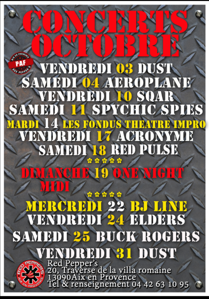 Bonjour à tous ! Voici les concerts du mois d'Octobre au 🌶️RED PEPPER'S 🌶️résas au 0442631095 ☎️
